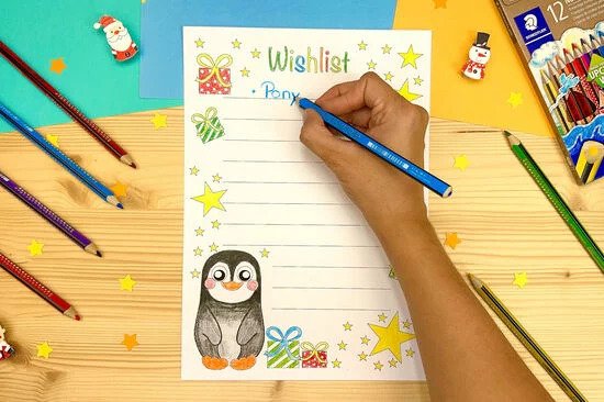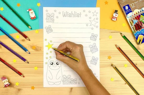 A letölthető mintával és a Noris Colour Jumbo színes ceruzákkal könnyedén elkészíthetik saját, egyedi karácsonyi kívánságlistájukat.