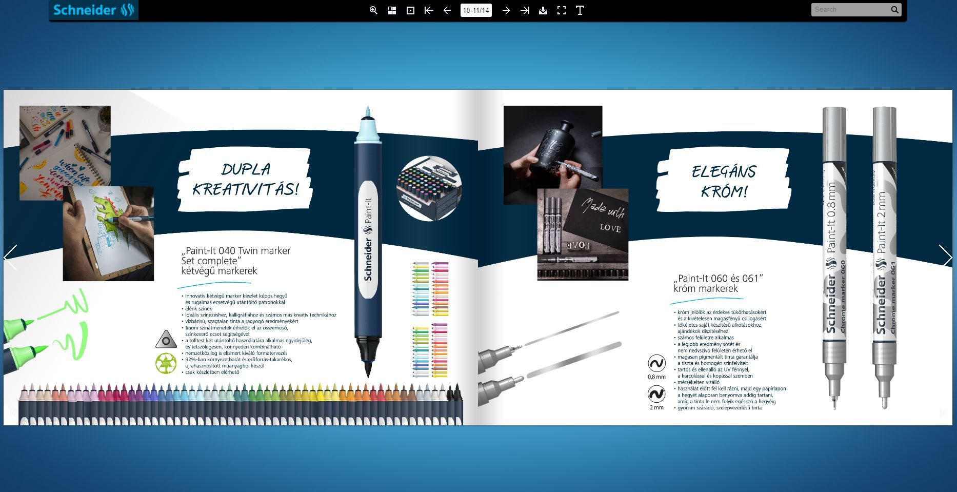 A kivételes írásélményt nyújtó golyós- és rollertollak, különleges töltőtollak és tűfilcek, valamint az elnyűhetetlen markerek bemutatása mellett fontos célunk, hogy segítsük a vásárlókat a számukra legmegfelelőbb termékek kiválasztásában. Ennek érdekében a Schneider Marker kisokost és a kreatív projektek megvalósításához ajánlott, különleges írószereket bemutató Paint-it brosúrát is elérhetővé tettük a megújult oldalon.