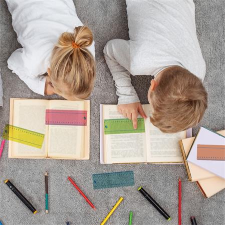 Speciális írást és olvasás segítő színes vonalzó készlet, hasznos zárható tokban.